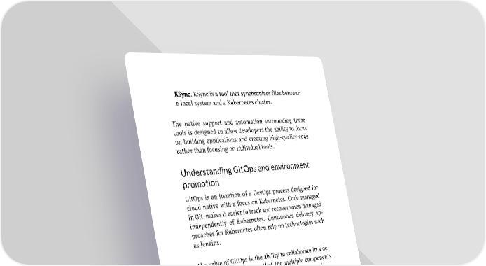KSync. KSync is a tool that synchronizes files between a local system and a Kubernetes cluster. The native support and automation surrounding these tools is designed to allow developers the ability to focus on building applications and creating high-quality code rather than focusing on individual tools. Understanding GitOps and environment promotion GitOps is an iteration of a DevOps process designed for cloud native with a focus on Kubernetes. Code managed in Git, makes it easier to track and recover when managed independently of Kubernetes. Continuous delivery ap- proaches for Kubernetes often rely on technologies such as Jenkins. The value of GitOps is the ability to collaborate in a de- clarative environment so that the multiple components within a microservices environment can be managed. GitOps enables the developers to manage and monitor all of the applications and the entire cloud native stack. With GitOps it is much easier for the developer to learn and manage complex Kubernetes clusters. One of the greatest benefits of GitOps is that it acts a uni- fied “source of the truth.” Version control, history, peer review and rollbacks all are managed within the GitOps environment. This is important when it comes to Jenkins X. 59