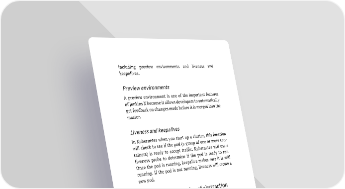 including preview environments and liveness and keepalives. Preview environments A preview environment is one of the important features of Jenkins X because it allows developers to automatically get feedback on changes made before it is merged into the master. Liveness and keepalives In Kubernetes when you start up a cluster, this function will check to see if the pod (a group of one or more con- tainers) is ready to accept traffic. Kubernetes will use a liveness probe to determine if the pod is ready to run. Once the pod is running, keepalive makes sure it is still running. If the pod is not running, liveness will create a new pod. Jenkins X and the value of abstraction This chapter provided you with the ability to get started quickly with Jenkins X and Kubernetes. In truth Kuber- netes out of the box is incredibly difficult to work with. For developers, it can take a long time to understand the basics – and even longer to become productive. Develop- ers who have begun their journey with Jenkins X don’t have to know the underlying details of Kubernetes before they can start delivering value. And, better yet, they can avoid common mistakes that could delay them from de- veloping cloud native applications fast. 69