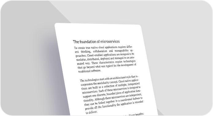 The foundation of microservices To create true native cloud applications requires differ- ent thinking, collaboration and manageability ap- proaches. Cloud-enabled applications are designed to be modular, distributed, deployed and managed in an auto- mated way. These characteristics require technologies that go beyond what was typical for the development of traditional software. The technologies start with an architectural style that in- corporates the modularity concept. Cloud native applica- tions are built as a collection of multiple, independent microservices. Each of these microservices is designed to support one discrete, bounded piece of application func- tionality. Although these microservices are independent, they can be linked together in a coordinated fashion to provide all the functionality the application is intended to deliver. Microservices provide a number of significant benefits: ▪ Application development is simplified since each microservice is built to serve a specific and lim- ited purpose. Small development teams can fo- cus on writing code for narrowly defined and more easily understood functions. ▪ Code changes will be smaller and less complex than with a complex integrated application, making it easier and faster to make changes, whether to fix a problem or to upgrade a service with new requirements. ▪ Scalability - both up and down - makes it simpler to deploy an additional instance of a service or change that service as needs evolve. 37