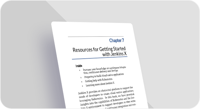 Chapter 7 Resources for Getting Started with Jenkins X Inside » Increase your knowledge on continuous integra- tion, continuous delivery and DevOps » Preparing to build cloud native applications » Getting help with Kubernetes » Learning more about Jenkins X Jenkins X provides an abstracted platform to support the needs of developers to create cloud native applications leveraging Kubernetes. In this book, we have provided insights into the capabilities of Kubernetes and the Jen- kins X environment to support developers as they enter the world of DevOps and continuous integration and con- tinuous delivery services. In this chapter, we provide links to resources that will help your teams get started. Continuous integration, continuous delivery and DevOps resources What is DevOps? Building continuous delivery pipelines with Jenkins Business value of Jenkins X Master DevOps for software innovation 70