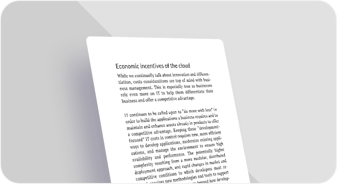 Economic incentives of the cloud While we continually talk about innovation and differen- tiation, costs considerations are top of mind with busi- ness management. This is especially true as businesses rely even more on IT to help them differentiate their business and offer a competitive advantage. IT continues to be called upon to “do more with less” in order to build the applications a business requires and to maintain and enhance assets already in products to offer a competitive advantage. Keeping these “development- focused” IT costs in control requires new, more efficient ways to develop applications, modernize existing appli- cations, and manage the environment to ensure high availability and performance. The potentially higher complexity resulting from a more modular, distributed deployment approach, and rapid changes in market and competitive conditions to which developers must re- spond, requires new methodologies and tools to support development efforts. But costs go beyond how develop- ers do their jobs. Many companies, facing the need to ex- pand their IT presence with more systems, storage, and other assets, may quickly find their costs can outstrip their budget. One way to cut costs is to adopt affordable public cloud services that make it possible to implement changes quickly and scale up and down depending on a business’ changing needs. Achieving enterprise agility The new generation of agile application development and deployment means software services can be developed and deployed virtually anywhere. Microservices enable 15