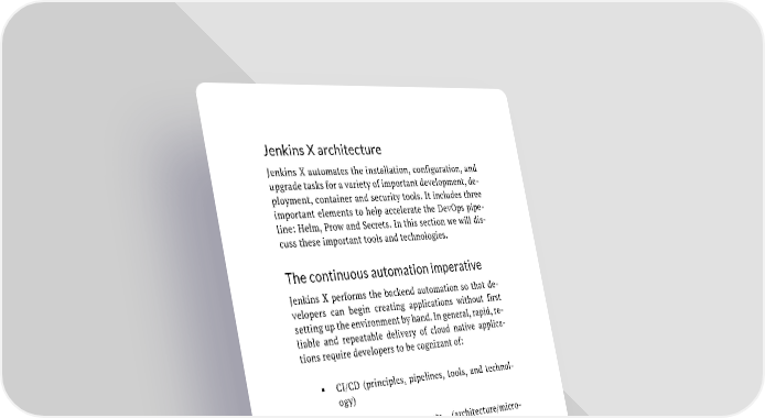 Jenkins X architecture Jenkins X automates the installation, configuration, and upgrade tasks for a variety of important development, de- ployment, container and security tools. It includes three important elements to help accelerate the DevOps pipe- line: Helm, Prow and Secrets. In this section we will dis- cuss these important tools and technologies. The continuous automation imperative Jenkins X performs the backend automation so that de- velopers can begin creating applications without first setting up the environment by hand. In general, rapid, re- liable and repeatable delivery of cloud native applica- tions require developers to be cognizant of: ▪ CI/CD (principles, pipelines, tools, and technol- ogy) ▪ Cloud native concepts (architecture/micro- services, technology, principles etc.) ▪ Containers ▪ Kubernetes/container orchestration It may take weeks or even months for a team of develop- ers to teach themselves about these topics and then build the applications. Instead, Jenkins X provides developers and small teams a guided solution for delivering cloud native apps on Kubernetes using CI/CD practices. A key component to Jenkins X is automation throughout the platform. Jenkins X is designed to continuously auto- mate every aspect of Kubernetes from the installation 56