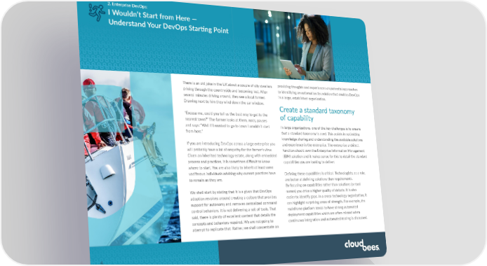 2. Enterprise DevOps: I Wouldn’t Start from Here — Understand Your DevOps Starting Point There is an old joke in the UK about a couple of city dwellers providing thoughts and experiences on potential approaches driving through the countryside and becoming lost. After to identifying an automation foundation that enables DevOps several minutes driving around, they see a local farmer. in a large, established organization. Drawing next to him they wind down the car window. Create a standard taxonomy “Excuse me, could you tell us the best way to get to the of capability nearest town?” The farmer looks at them, nods, pauses and says: “Well if I wanted to go to town I wouldn’t start In large organizations, one of the key challenges is to ensure from here.” that a standard taxonomy is used. This assists in optimizing knowledge sharing and understanding the available solutions If you are introducing DevOps across a large enterprise you and experience in the enterprise. The enterprise architect will probably have a lot of empathy for the farmer’s view. function should own the Enterprise Information Management Given an inherited technology estate, along with embedded (EIM) solution and it makes sense for this to detail the standard process and practices, it is sometimes difficult to know capabilities you are looking to deliver. where to start. You are also likely to inherit at least some vociferous individuals advising why current practices have Defining these capabilities is critical. Technologists, as a rule, to remain as they are. are better at defining solutions than requirements. By focusing on capabilities rather than solutions (or tool We shall start by stating that it is a given that DevOps names) you drive a higher quality of debate. It is also adoption revolves around creating a culture that provides easier to identify gaps. In a cross-technology organization, it support for autonomy and removes centralized command can highlight surprising areas of strength. For example, the control behaviors. It is not delivering a raft of tools. That mainframe platform tends to have strong automated said, there is plenty of excellent content that details the deployment capabilities which are often missed when concepts and behaviors required. We are not going to continuous integration and automated testing is discussed. attempt to replicate that. Rather, we shall concentrate on 4.