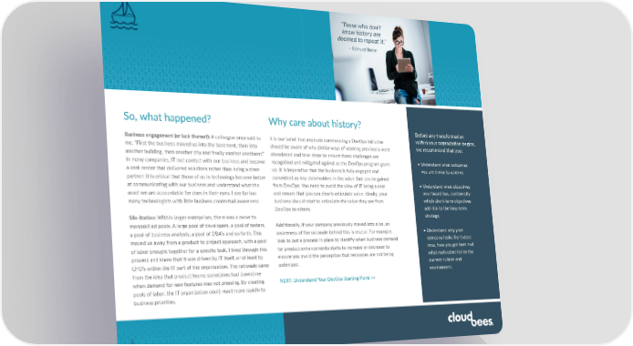 “Those who don’t know history are doomed to repeat it.” – Edmund Burke So, what happened? Why care about history? Before any transformation Business engagement (or lack thereof): A colleague once said to It is our belief that anybody commencing a DevOps initiative within your organization begins, me, “First the business moved us into the basement, then into should be aware of why similar ways of working previously were we recommend that you: another building, then another city and finally another continent.” abandoned and take steps to ensure those challenges are In many companies, IT lost contact with our business and became recognized and mitigated against as the DevOps program gears • Understand what outcomes a cost center that delivered solutions rather than being a close up. It is imperative that the business is fully engaged and you are trying to achieve. partner. It is critical that those of us in technology become better committed as key stakeholders in the value that can be gained at communicating with our business and understand what the from DevOps. You need to avoid the view of IT being a cost • Understand what objectives asset we are accountable for does in their eyes. I see far too and ensure that you can clearly articulate value. Ideally, your your board has, and identify many technologists with little business contextual awareness. business should start to articulate the value they see from which short-term objectives DevOps to others. add risk to the long-term Silo-ization: Within larger enterprises, there was a move to strategy. monoskilled pools. A large pool of developers, a pool of testers, Additionally, if your company previously moved into silos, an a pool of business analysts, a pool of DBA’s and so forth. This awareness of the rationale behind this is crucial. For example, • Understand why your moved us away from a product to project approach, with a pool look to put a process in place to identify when business demand company looks like it does of labor brought together for a specific task. I lived through this for product enhancements starts to increase or decrease to now, how you got here and process and know that it was driven by IT itself, or at least by ensure you avoid the perception that resources are not being what motivators led to the CFO’s within the IT part of the organization. The rationale came optimized. current culture and from the idea that product teams sometimes had downtime environment. when demand for new features was not pressing. By creating NEXT: Understand Your DevOps Starting Point >> pools of labor, the IT organization could react more rapidly to business priorities. 3.